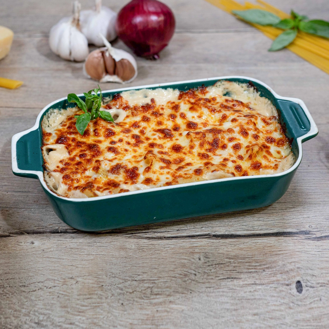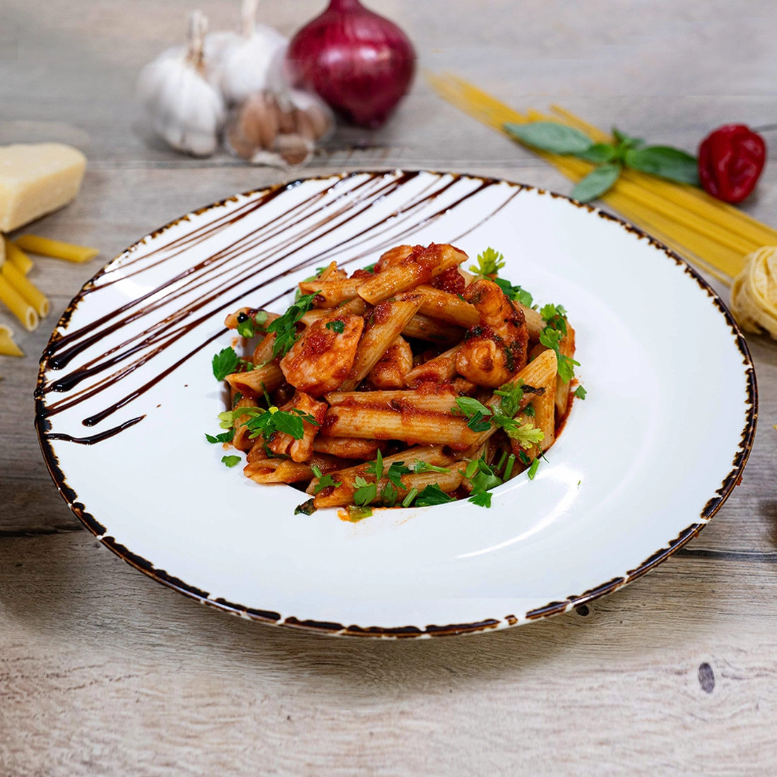 paste, sos roșii, piept pui, ciuperci, ardei gras, ceapă, usturoi, mozzarella