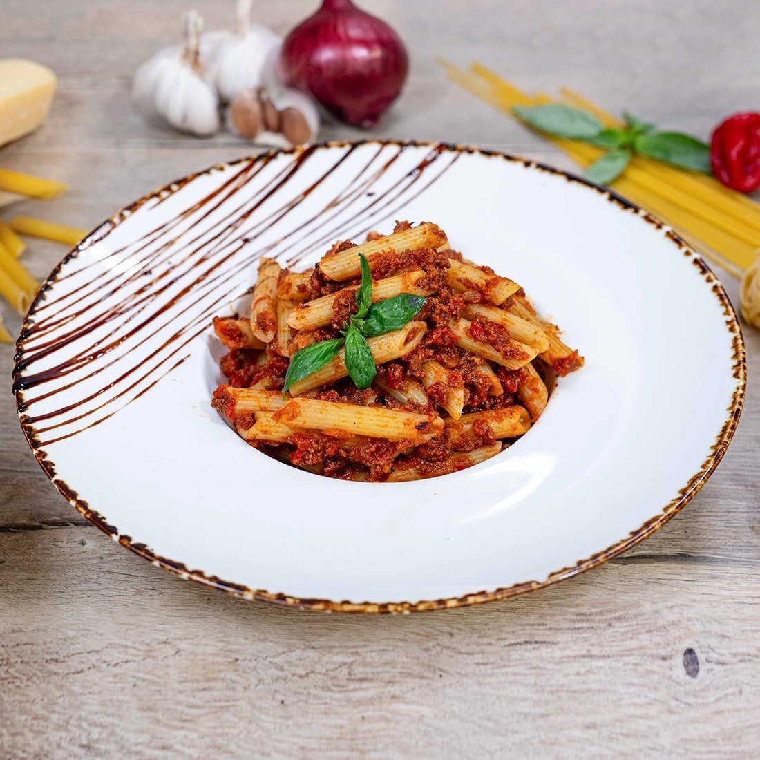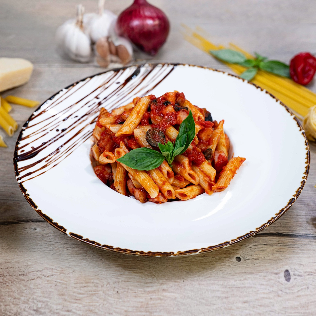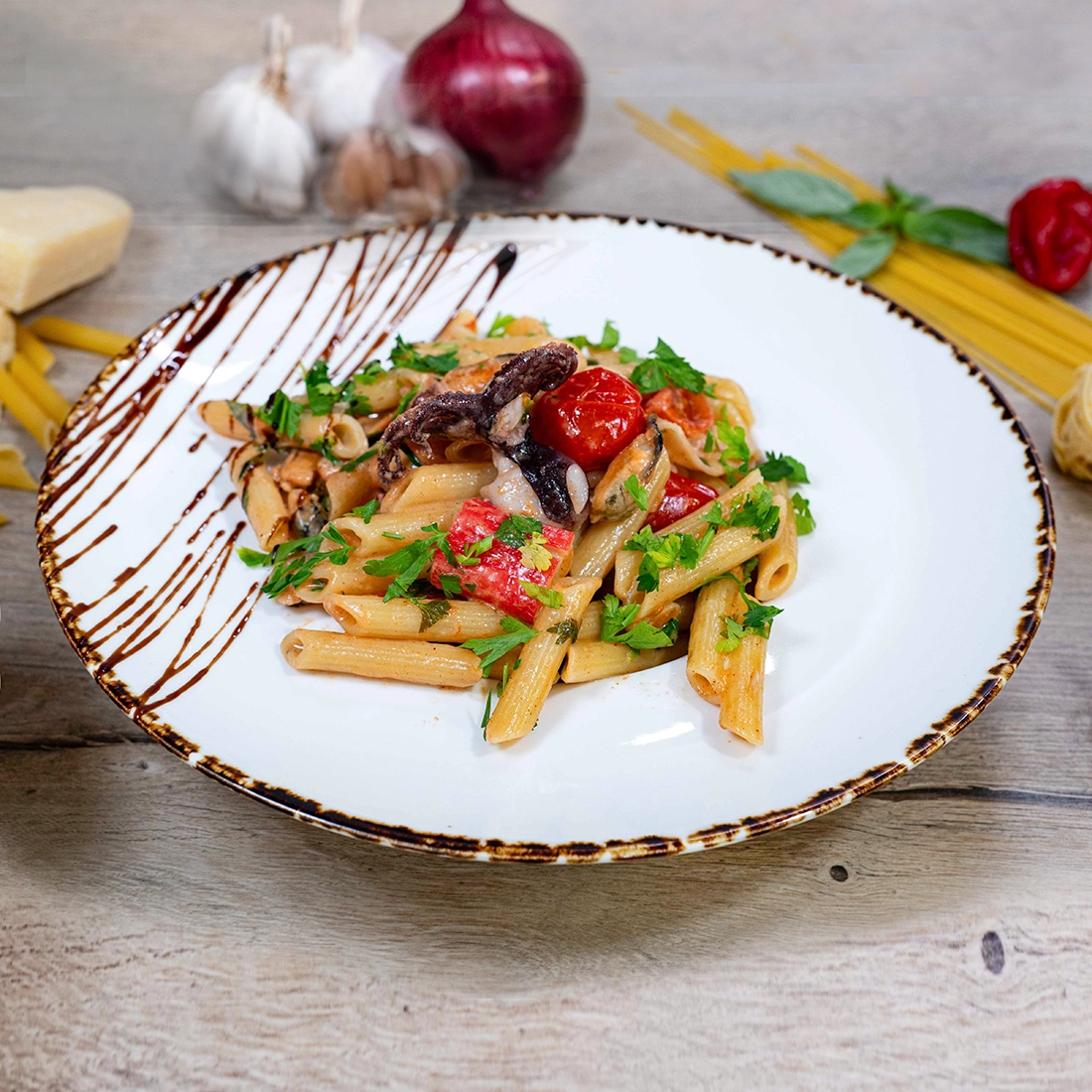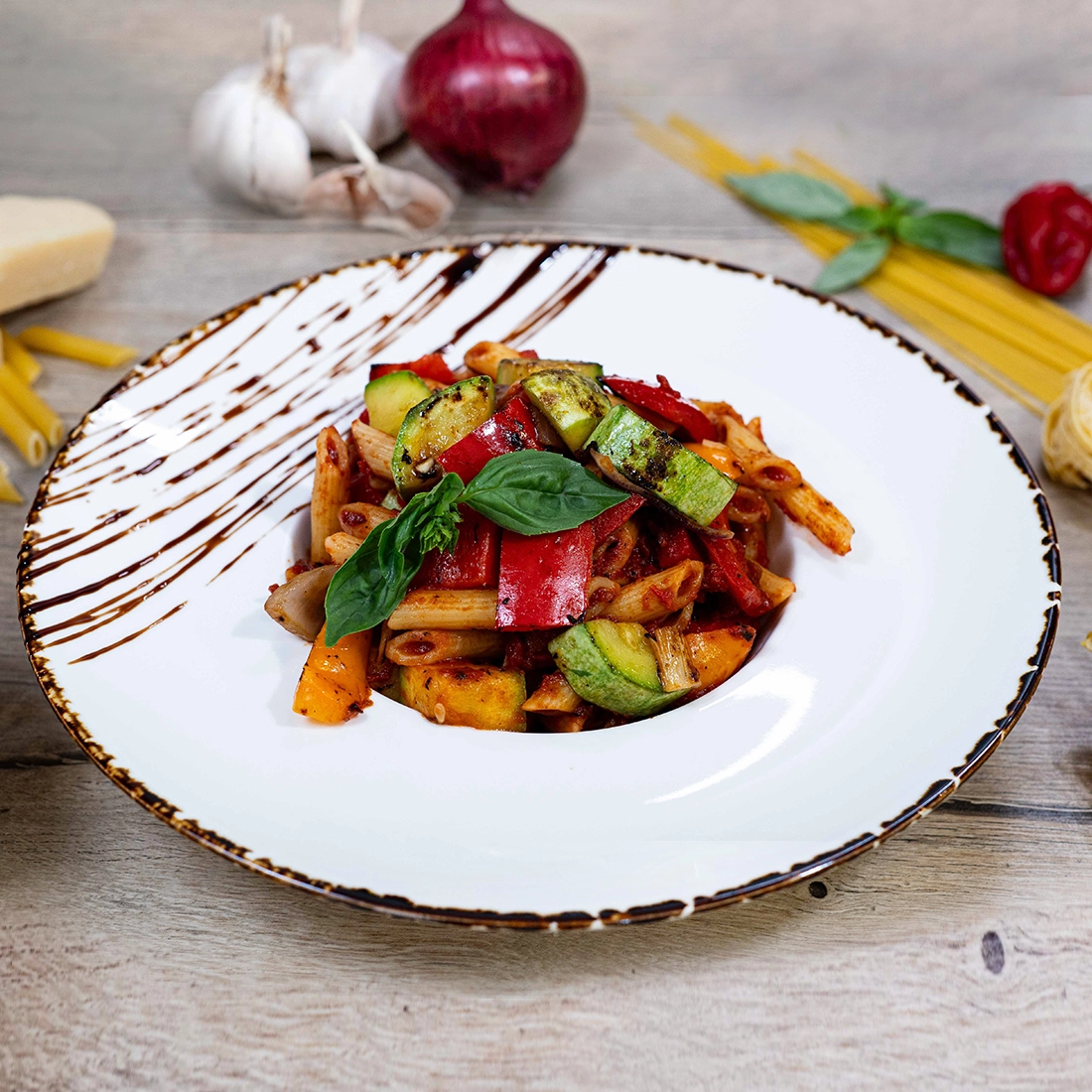 paste, sos roșii, ciuperci, dovlecei, ardei gras, ceapă, usturoi